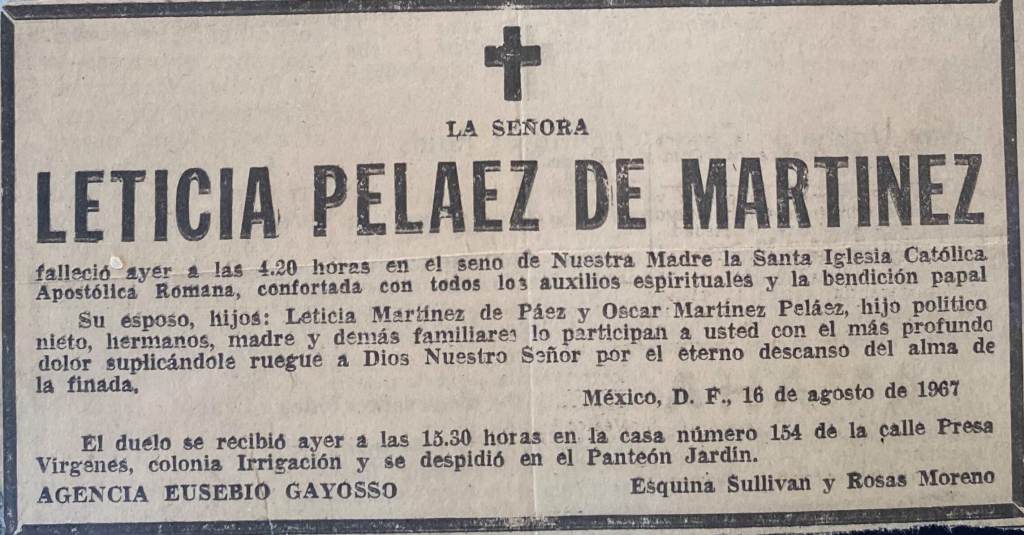Oscar escribió, hablando del regreso del viaje a Europa, que su madre anheló y logró: “Regresando a México, Leticia empezó a sentirse mal de la columna, seguramente por tanta caminada o por cargar las maletas. ¿Estaría dándole reumatismo?… nada de eso. Ese fue el principio del cáncer que se la llevaría en pocos meses. Vivió sólo cincuenta y tres años, pero logró sus objetivos. Una corta vida, pero razonablemente feliz, y se ahorró ver mucho que creo no hubiera sido de su agrado.”